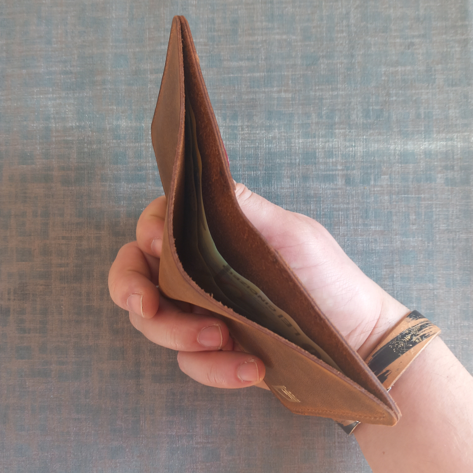 Pielea utilizata este crazy horse,o piele de bovina chiar daca numele spune altceva.este o piele cu un caracter aparte care primeste o patina frumoasa in timp si care da o personalitate aparte fiecarui portofel.Micile diferente si schimbari de culoare raman caracteristicile principale a acestui tip de piele si face unic fiecare portofel iar cusutul manual completeaza caracterul frumos si vine cu un plus de calitate pentru portofel.