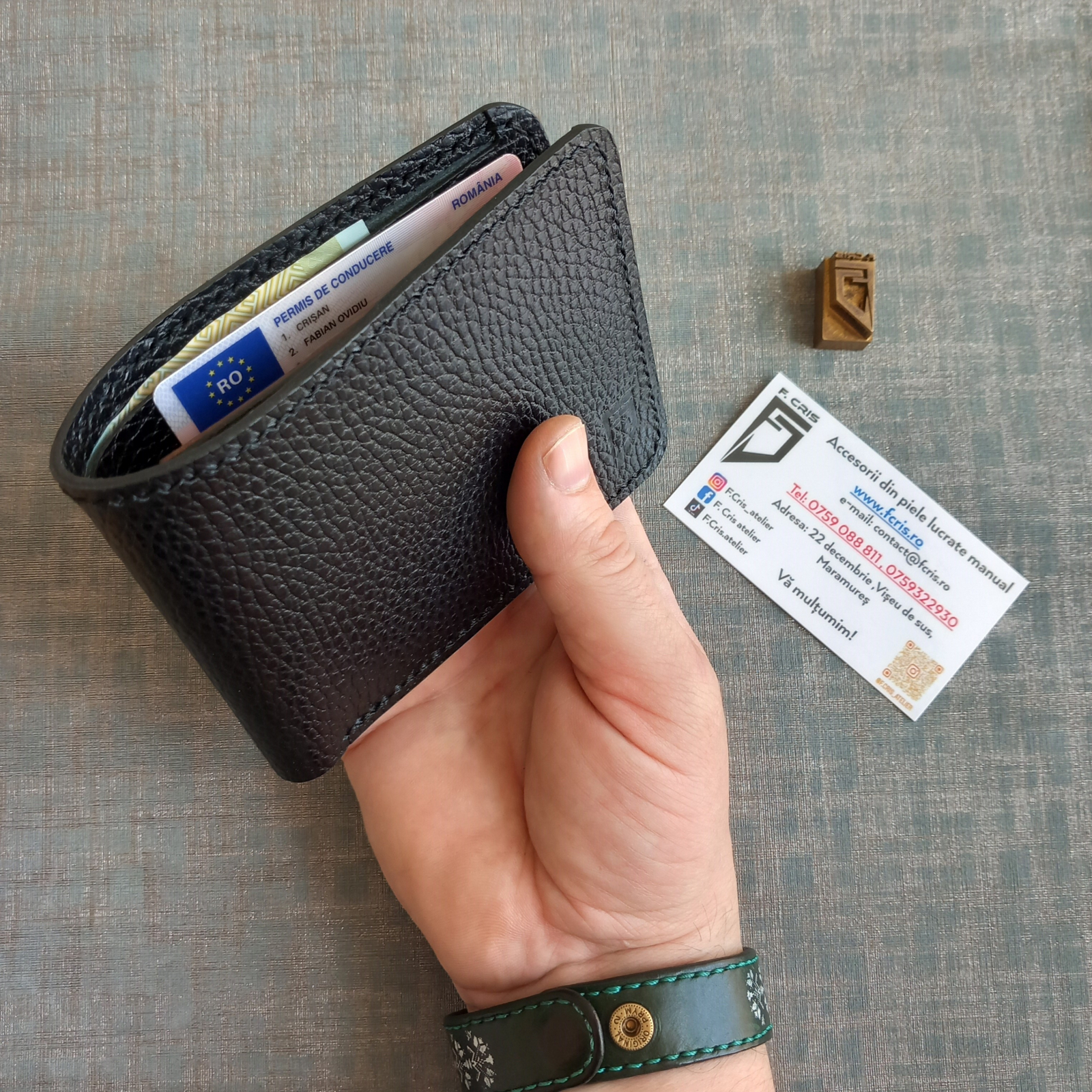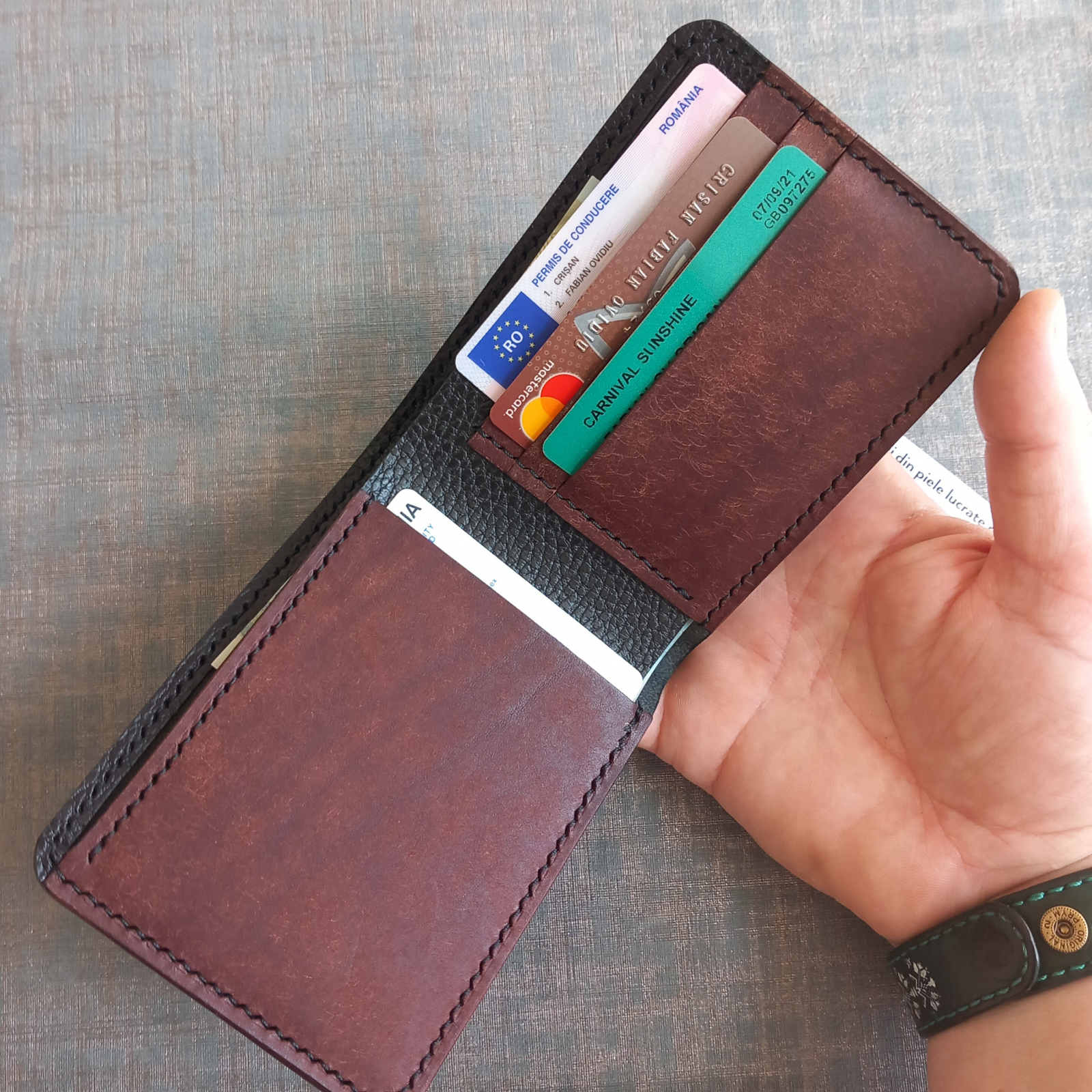 Portofel bărbătesc din piele naturală, negru cu maro tabac. Design minimalist, realizat manual în Maramureș. Practic, subțire și elegant – ideal pentru zi cu zi.
